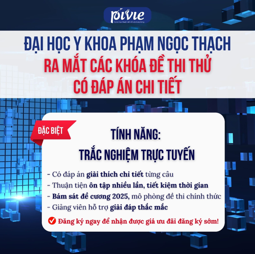 Trường trực tuyến Pivie trân trọng thông báo: Các khóa Đề thi thử mô phỏng kỳ thi Sau đại học tại Đại học Y Khoa Phạm Ngọc Thạch đã chính thức được ra mắt và mở đăng ký trên hệ thống.