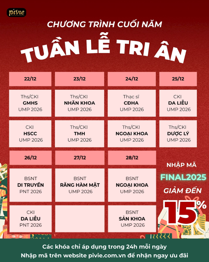 Nhằm tri ân Quý Anh/Chị học viên đã tin tưởng và đồng hành cùng PIVIE trong suốt thời gian qua, PIVIE trân trọng thông báo triển khai Chương trình ưu đãi cuối năm – Tuần lễ Tri ân, áp dụng cho các khóa Ôn thi Sau đại học 2026 theo lịch chuyên ngành cụ thể.