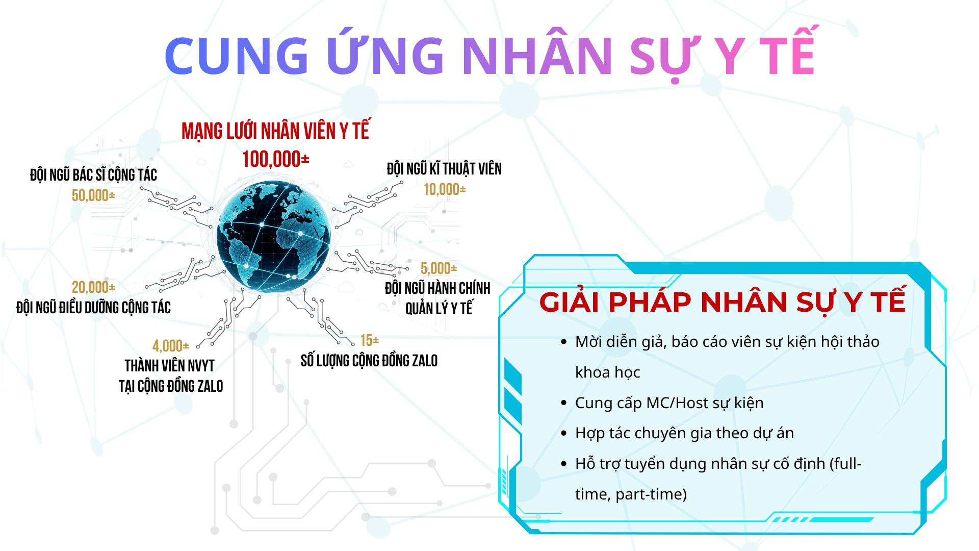Pivie sở hữu mạng lưới nhân sự y tế rộng khắp trong và ngoài nước, bao gồm bác sĩ, dược sĩ, điều dưỡng, giảng viên và các chuyên gia y khoa ở nhiều chuyên ngành. Với kinh nghiệm thực tiễn trong tuyển chọn, kết nối và điều phối nhân sự cho hội thảo khoa học, chương trình CME, đào tạo và các dự án y tế, Pivie đáp ứng linh hoạt nhu cầu nhân sự ngắn hạn và dài hạn của đối tác